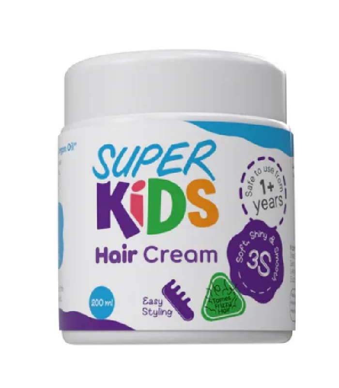 سوبر كيدز كريم شعر – 200 مل هو كريم تصفيف مخصص للأطفال بتركيبة لطيفة وخفيفة، مصممة لتغذية الشعر، تقليل الهيشان، وتسهيل التصفيف بدون دموع أو شد.